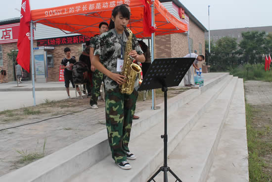 在軍訓(xùn)場(chǎng)地上,有一群這樣的人,他們手拿長(zhǎng)笛、沙克斯、黑管、小號(hào)……用這樣的裝備為我們的新兵加油助威。