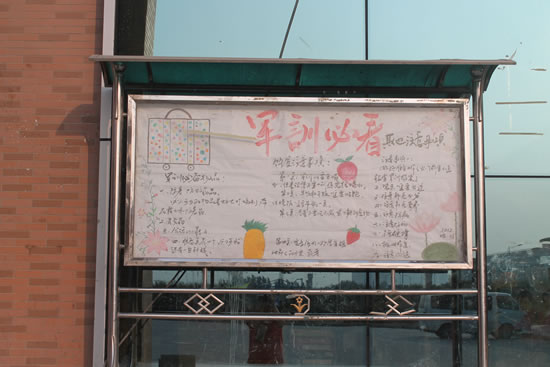 即便如此,仍有不如人意的地方:天公不愿作美,兩場(chǎng)暴雨將國(guó)旗下的營(yíng)連評(píng)比專欄洗刷干凈,和教官協(xié)商后,按其要求重新制作。為了融合90后新生的審美情緒,宣傳欄在設(shè)計(jì)之初就以漫畫(huà)作為主體,拒絕死板,貼近學(xué)生。同學(xué)們對(duì)軍訓(xùn)感想和日志的關(guān)注度很高,每天我們都對(duì)各系室報(bào)送的稿件進(jìn)行審稿和統(tǒng)計(jì),為優(yōu)秀學(xué)員和先進(jìn)集體的評(píng)比提供數(shù)據(jù),也為同學(xué)們創(chuàng)建一個(gè)展示自我的平臺(tái)。
