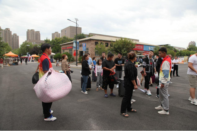 從學院大門到學生公寓樓,志愿者服務隊熱情幫助學子搬運行李,指引道路……