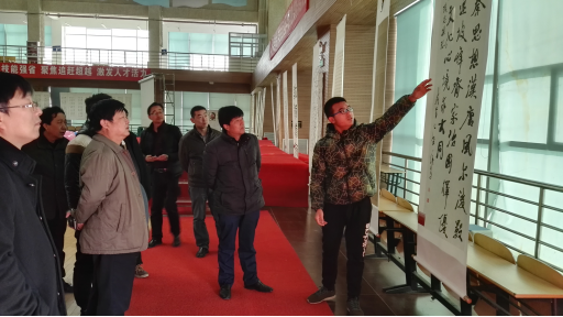 墨香書法社團(tuán)曹恒源同學(xué)向李院長及各位參觀領(lǐng)導(dǎo)講解參展作品