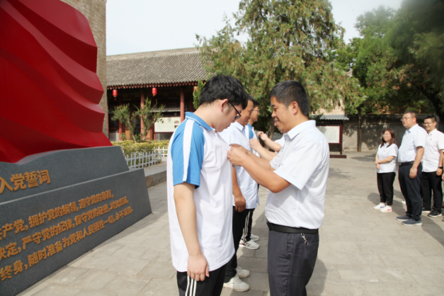 老黨員代表給新黨員代表佩戴、配發(fā)黨徽