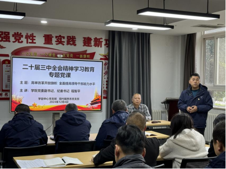 為深入學(xué)習(xí)習(xí)近平總書記在黨的二十屆三中全會(huì)上的重要講話精神,深刻領(lǐng)會(huì)和把握進(jìn)一步全面深化改革的主題、重大原則、重大舉措、根本保證,引導(dǎo)全體黨員、干部著力把進(jìn)一步全面深化改革的戰(zhàn)略部署轉(zhuǎn)化為推進(jìn)中國(guó)式現(xiàn)代化的強(qiáng)大力量,12月4日下午,現(xiàn)代服務(wù)系黨支部聯(lián)合學(xué)管中心黨支部,邀請(qǐng)學(xué)院黨委副書記、紀(jì)委書記程智平講授學(xué)習(xí)貫徹黨的二十屆三中全會(huì)精神專題黨課。