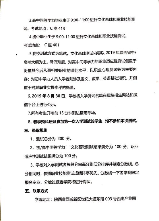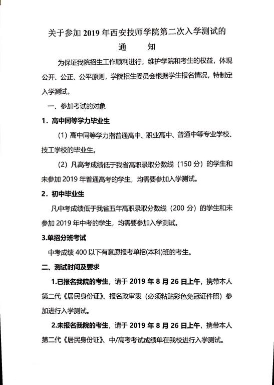 關(guān)于參加2019年西安技師學(xué)院第二次入學(xué)測(cè)試通知