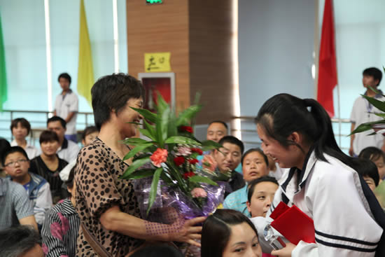 會(huì)議安排了受表彰的學(xué)生向自己的家長(zhǎng)獻(xiàn)花活動(dòng),感謝父母對(duì)自己的養(yǎng)育之恩,他們以自己優(yōu)異的成績(jī)來(lái)回報(bào)父母。手捧孩子送的鮮花,許多家長(zhǎng)流下了激動(dòng)和欣慰的淚水。接著,獲獎(jiǎng)學(xué)生代表上臺(tái)發(fā)言,感謝學(xué)校和老師對(duì)自己的培養(yǎng),他們堅(jiān)信“今天我為學(xué)校而自豪,明天學(xué)校為我而驕傲”。與會(huì)家長(zhǎng)代表也上臺(tái)發(fā)言,感謝學(xué)校對(duì)孩子的栽培,并對(duì)學(xué)校的各項(xiàng)工作給予了高度的肯定和贊揚(yáng)。