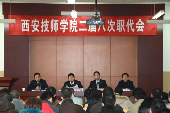 201116,西安技師學(xué)院二屆八次職代會在咸陽校區(qū)隆重召開。教職工正式代表和列席代表共60人參加了會議。會議由學(xué)院副院長、紀(jì)委書記袁建章主持。
