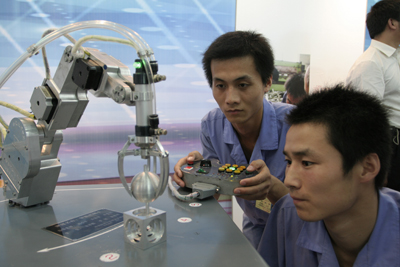 學院預備技師班畢業(yè)生正在調(diào)試自己設(shè)計制作的多功能機械手
