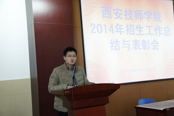 2014年12月2日下午,學(xué)院“2014年招生工作總結(jié)暨表彰大會(huì)”,在西安技師學(xué)院咸陽校區(qū)C座301室樂學(xué)堂召開。參加本次大會(huì)的有院長(zhǎng)李長(zhǎng)江、副院長(zhǎng)王德意 、紀(jì)委書記兼副院長(zhǎng)袁建章、副院長(zhǎng)趙輝以及全體教職工,大會(huì)由王德意副院長(zhǎng)主持。