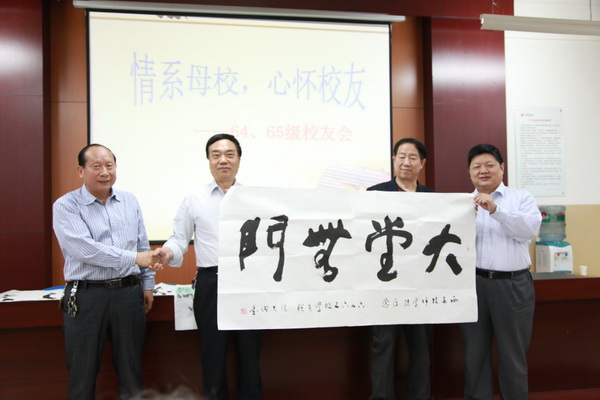 接下來,在C302召開64、65級校友會座談會,出席本次會議的有院長李長江、紀委書記兼副院長袁建章、院辦主任張民、學(xué)生處處長崔嵬以及64、6576位老校友。大會由學(xué)生工作處處長崔嵬主持。 會議開始前,主持人給大家播放了從文革前夕到現(xiàn)在有關(guān)校友們的視頻,和大家一起憶往昔、看今朝。會議第一項由李長江院長向廣大校友致歡迎詞,歡迎校友們在五十年后還能在聚母校敘舊,以及我院五十年的發(fā)展變化及取得的優(yōu)秀成果。會議第二項由校友代表發(fā)言,楊超、賴為民、卜先聞等3名同志以深情、激昂的發(fā)言表達了對母校、對同學(xué)的懷念之情。最后校友們?yōu)楸磉_對學(xué)校的感激之情,送上了他們親自書寫的字、畫?!按筇脽o門”、“鑄魂之旅”、“牡丹滿園”