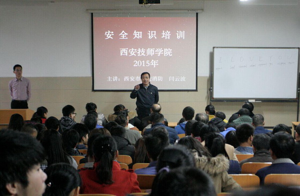 西安技師學院十分重視校園消防安全工作,根據(jù)集團公司保衛(wèi)部2015年119消防宣傳工作通知精神,學院保衛(wèi)處及早安排布置,11月11日,學院保衛(wèi)處聘請西安市保安防火中心閆云波主任對我院行政人員、班主任、在校外包經營負責人及2015年新生各班班長共200余人,進行了一次校園安全逃生技能、消防意識教育培訓。會后,組織參會人員進行了消防實戰(zhàn)演練。