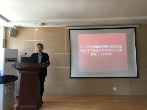 會上,公共課教研室主任陳宏茹老師總結(jié)了2016年連讀班成考輔導(dǎo)工作,她在總結(jié)中肯定了班主任老師的辛勤付出和代課老師的教學(xué)創(chuàng)新,正是因?yàn)榇蠹业凝R心協(xié)力,2016年學(xué)生的成人高考通過率達(dá)到86%。隨后,學(xué)生工作處處長崔嵬向參會人員詳細(xì)說明了學(xué)生連讀后的學(xué)籍管理和學(xué)制變動情況;招生辦主任賈靖就有關(guān)連讀學(xué)生招生宣傳政策做了詳盡的解讀;信息與藝術(shù)系主任王楠代表全系老師表態(tài),他表示全系教師將以更大的信心和努力,做好2017年成人高考輔導(dǎo)工作,并就新一屆連讀班的班級管理和教學(xué)工作提出具體要求。