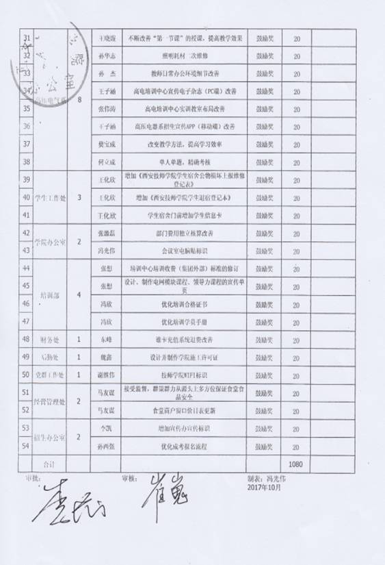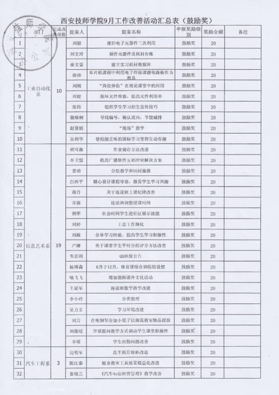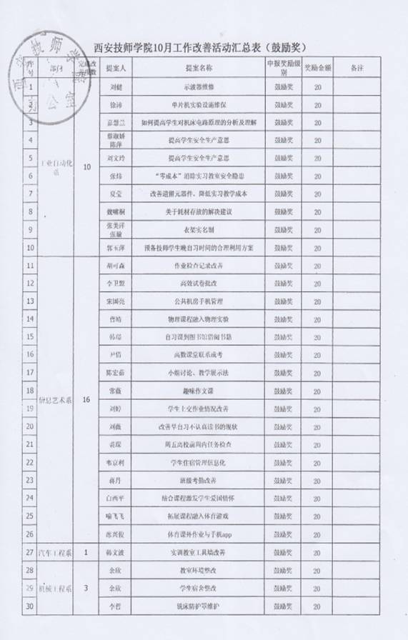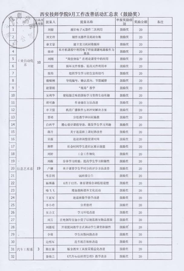 經(jīng)過個人申報,部門及精益推進辦審核后,11月6日,院長李長江對本年度9、10月份的教工精益改善“鼓勵獎”進行了審批,并特別指出,機電技術系(原工業(yè)自動化系)已從原來的增加改善數(shù)量轉變?yōu)楝F(xiàn)在的提高改善提案質量,從“量”到“質”的改變本身就是大的改善,給予了很高的評價?,F(xiàn)代服務系(原信息藝術系)提倡全員參與,系部的每一位老師都參與到精益改善當中。