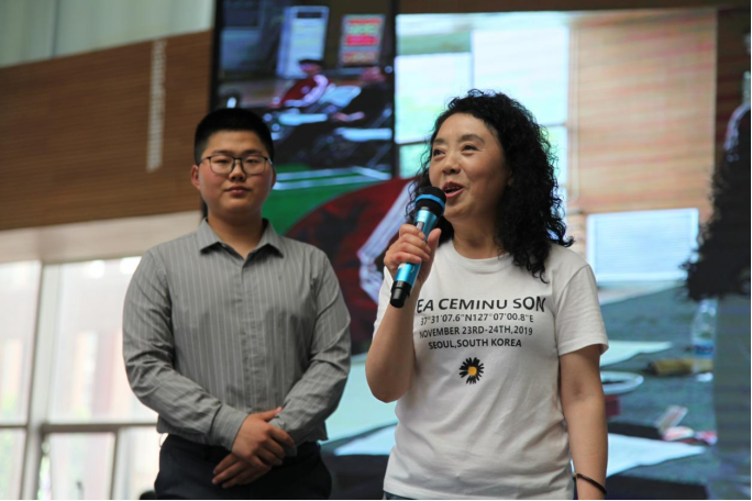 下午,學(xué)會(huì)一行人員、學(xué)院相關(guān)領(lǐng)導(dǎo)、老師及書(shū)法社成員、各系詩(shī)詞書(shū)法愛(ài)好者及學(xué)生代表共二百余人云集學(xué)院餐飲文體中心二樓進(jìn)行深度交流。曲作家和學(xué)院師生同臺(tái)亮嗓,進(jìn)行建黨百年散曲作品朗誦,作家們飽含深情,朗誦了專(zhuān)門(mén)為本次活動(dòng)撰寫(xiě)的曲作15首。隨后,散曲學(xué)會(huì)書(shū)法家張曼麗、杜耀志、蘇峰、王興一及學(xué)院書(shū)法社指導(dǎo)老師翟憲民先后登臺(tái)提筆揮墨,用楷、行、篆、隸等不同書(shū)法體,為我們黨的百年華誕送上美好的祝福。書(shū)法家們還對(duì)學(xué)院書(shū)法社學(xué)生的書(shū)法寫(xiě)作進(jìn)行了現(xiàn)場(chǎng)指導(dǎo)。