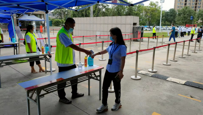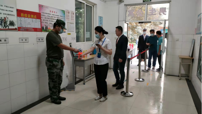 上午9時(shí),演練正式開(kāi)始。由各系抽選的40名班主任充當(dāng)“學(xué)生”,間距一米,整齊有序在學(xué)院北大門(mén)外排隊(duì),實(shí)景模擬入校場(chǎng)景。門(mén)口設(shè)置三個(gè)檢測(cè)口,每個(gè)檢測(cè)口均安排人員進(jìn)行測(cè)溫、掃碼、登記報(bào)到情況、維持秩序。