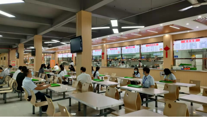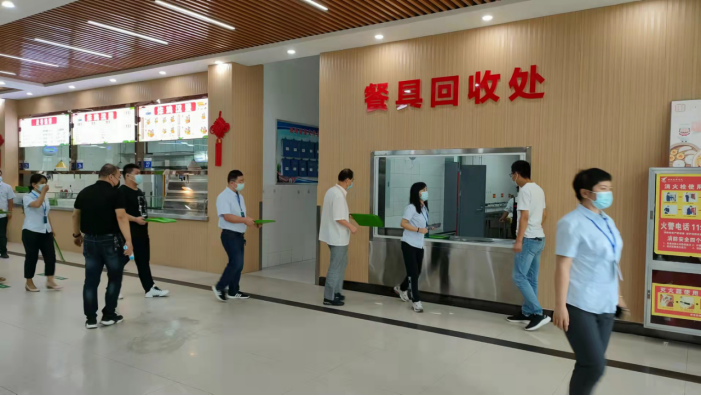 就餐環(huán)節(jié),“學(xué)生”們?cè)诓蛷d外有序排隊(duì)測(cè)溫,進(jìn)入餐廳后,保持1米間距快速配餐、就餐,用餐結(jié)束后,快速離開(kāi)。