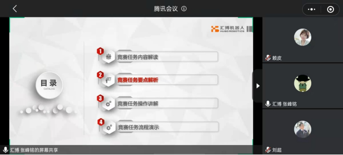 本次線上培訓由江蘇匯博機器人技術(shù)股份有限公司和蘇州工業(yè)園區(qū)立寧職業(yè)培訓學校有限公司聯(lián)合舉辦,邀請專業(yè)工程師采用騰訊會議的線上培訓形式,對物聯(lián)網(wǎng)安裝調(diào)試員(智能制造數(shù)字技術(shù)應(yīng)用)、模具工、電工、計算機及外部設(shè)備裝配調(diào)試員(智能傳感器應(yīng)用)、計算機程序設(shè)計員(工業(yè)機器人人工智能技術(shù)應(yīng)用)、人工智能訓練師(服務(wù)機器人人工智能技術(shù)應(yīng)用)六個賽項,重點圍繞競賽任務(wù)內(nèi)容解讀、競賽任務(wù)要點解析、競賽任務(wù)操作講解、競賽任務(wù)流程演示等方面進行解讀,引導選手們深入分析競賽規(guī)則,更好的適應(yīng)競賽各項要求。