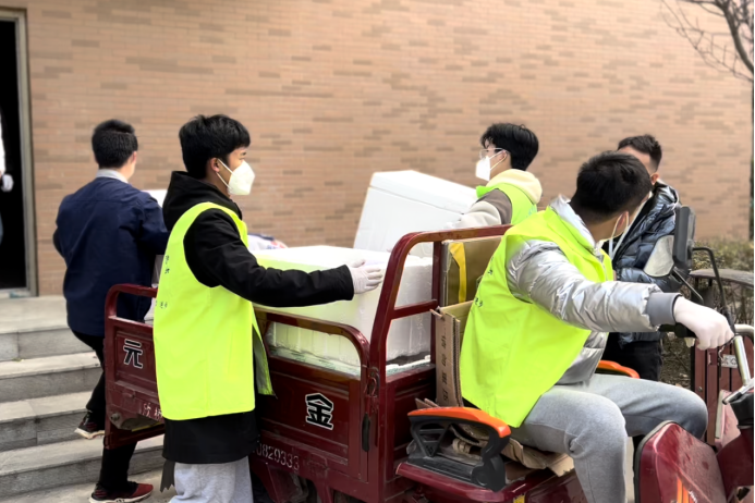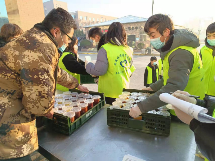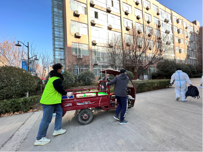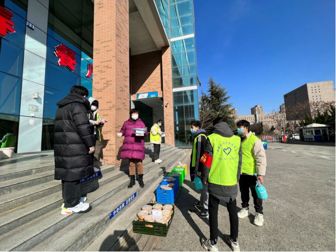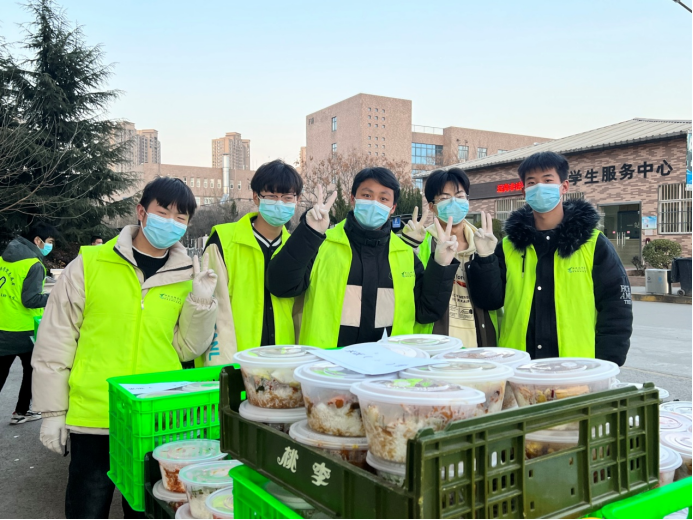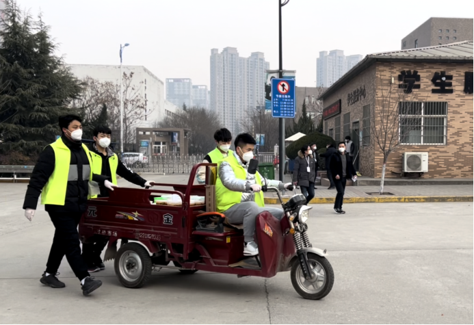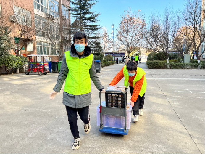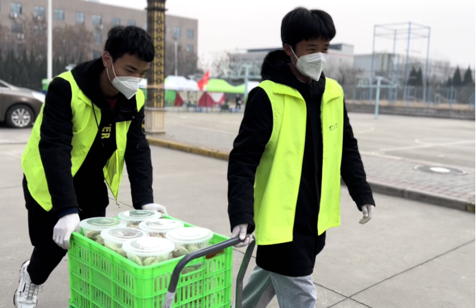 自12月28日學(xué)院啟動宿舍封閉管理以來,他們每天早出晚歸,頂著寒風(fēng),或騎著電動三輪車、或直接搬起餐筐從食堂魚貫而出,將一箱箱滿載著飯菜的筐子送達到各個宿舍樓下,每天早上7點、中午11點、下午5點,一日三餐,雷打不動的按時按量送達。