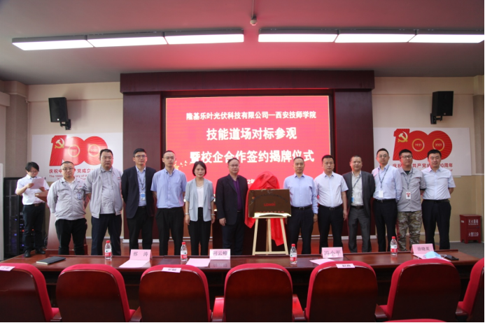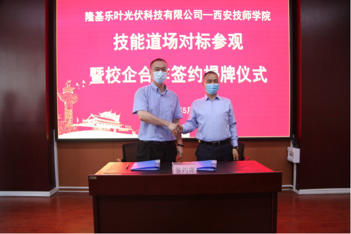 在與會領(lǐng)導(dǎo)和嘉賓的共同見證下,隆基樂葉光伏科技有限公司西安組件廠和西安技師學(xué)院簽署了校企合作協(xié)議。