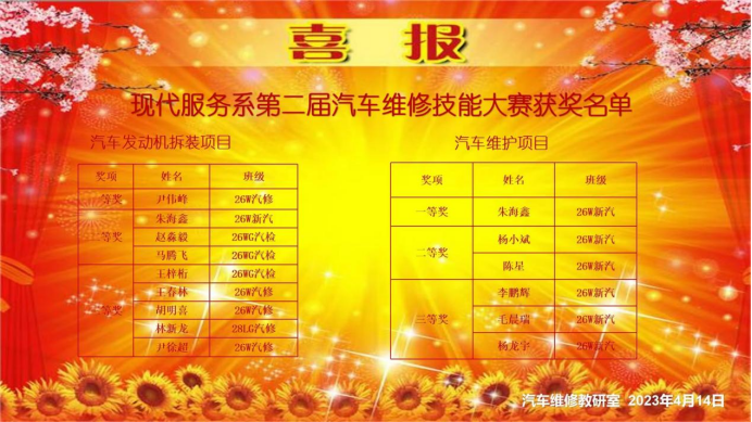 經(jīng)過激烈角逐,尹偉峰、朱海鑫、楊曉斌等14位同學(xué)脫穎而出,成績喜人。來自26W新汽班的參賽選手毛晨瑞同學(xué)說:“我非常珍惜參加這次比賽的機會,也非常感謝老師對我們的辛苦培養(yǎng)。通過這次比賽,我不僅在技能方面得到了提升,也鍛煉了我頑強的意志力和追求卓越、精益求精的精神,同時也找準(zhǔn)了今后學(xué)習(xí)的目標(biāo)。希望通過接下來的鍛煉,有機會代表學(xué)校參加更多的大賽,為學(xué)校和系部爭光?!?/p>