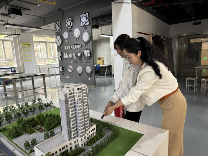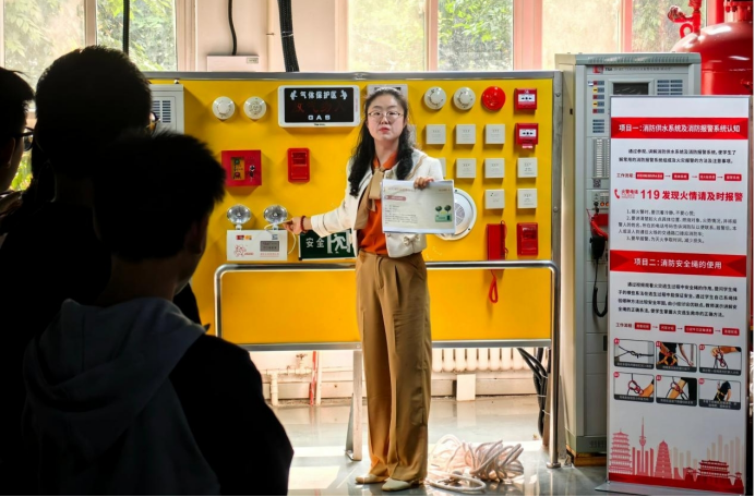 示范課上,韓璟副主任以校本教材《勞動(dòng)實(shí)踐手冊》為依據(jù),開展“關(guān)注消防 珍愛生命——學(xué)習(xí)消防安全”主題教學(xué)。她由電影《烈火英雄》導(dǎo)入,引導(dǎo)學(xué)生思考消防安全在日常生活中的重要性,形成學(xué)習(xí)基礎(chǔ)消防知識的自覺。隨后,韓璟副主任又依托素質(zhì)教育發(fā)展中心內(nèi)實(shí)物設(shè)施,帶領(lǐng)學(xué)生認(rèn)識了消防供水系統(tǒng)、噴淋系統(tǒng)及消火栓等消防設(shè)備,講解并演示了消防安全繩、滅火器等逃生自救裝備的使用方法,使學(xué)生初步掌握了火災(zāi)自救技巧,提升了自我保護(hù)能力。最后,韓璟副主任結(jié)合校園生活需要,強(qiáng)調(diào)了宿舍消防安全的注意事項(xiàng),提醒學(xué)生預(yù)防為主,自救為要,督促學(xué)生將課上所學(xué)內(nèi)化為真正能應(yīng)用的一項(xiàng)生活技能。