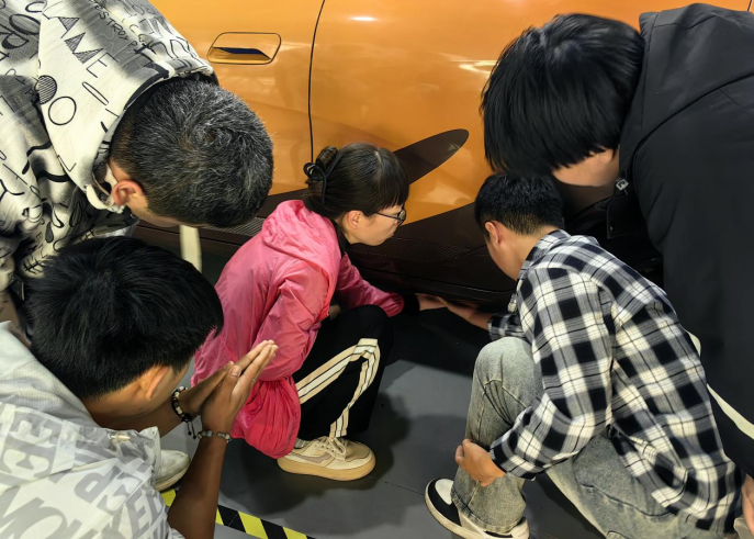 學(xué)生在教師帶領(lǐng)下進(jìn)行備胎更換作業(yè)