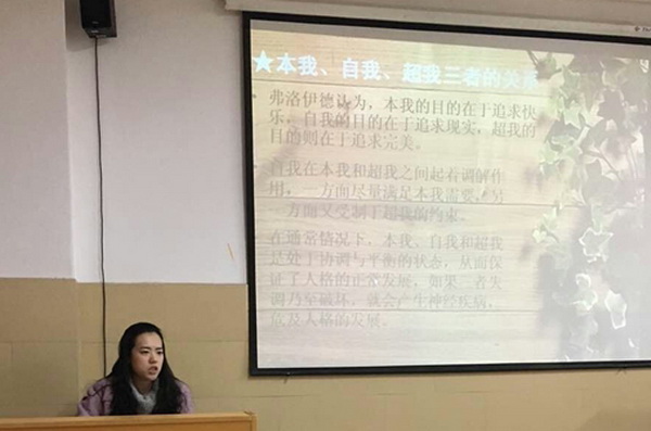 劉薇老師在講“佛洛依德人格理論”。 在劉老師的講解和分析下,專業(yè)的理論知識(shí)深入淺出、淺顯易懂。