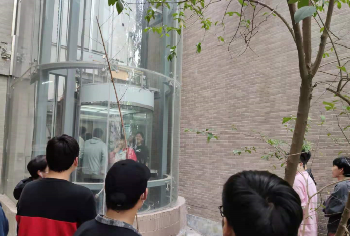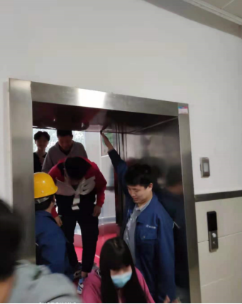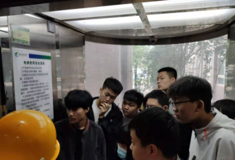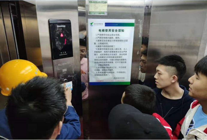 陳助理在轎廂內(nèi)給師生講解電梯轎廂內(nèi)相關(guān)標(biāo)志的作用、出現(xiàn)事故的應(yīng)急處理措施以及多種求救信號(hào)安全發(fā)送的方法。