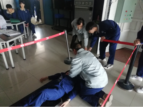 同學(xué)們按照應(yīng)急預(yù)案開始演練。學(xué)生在檢修電路時因違規(guī)操作發(fā)生不小心觸電事件,任課老師模擬進行緊急斷電處置,組織學(xué)生將觸電學(xué)生放平進行緊急搶救,撥打急救電話、胸外按壓等,整個過程有條不紊,只用了短短幾分鐘,做到了安全、有序、迅速的預(yù)期目標。